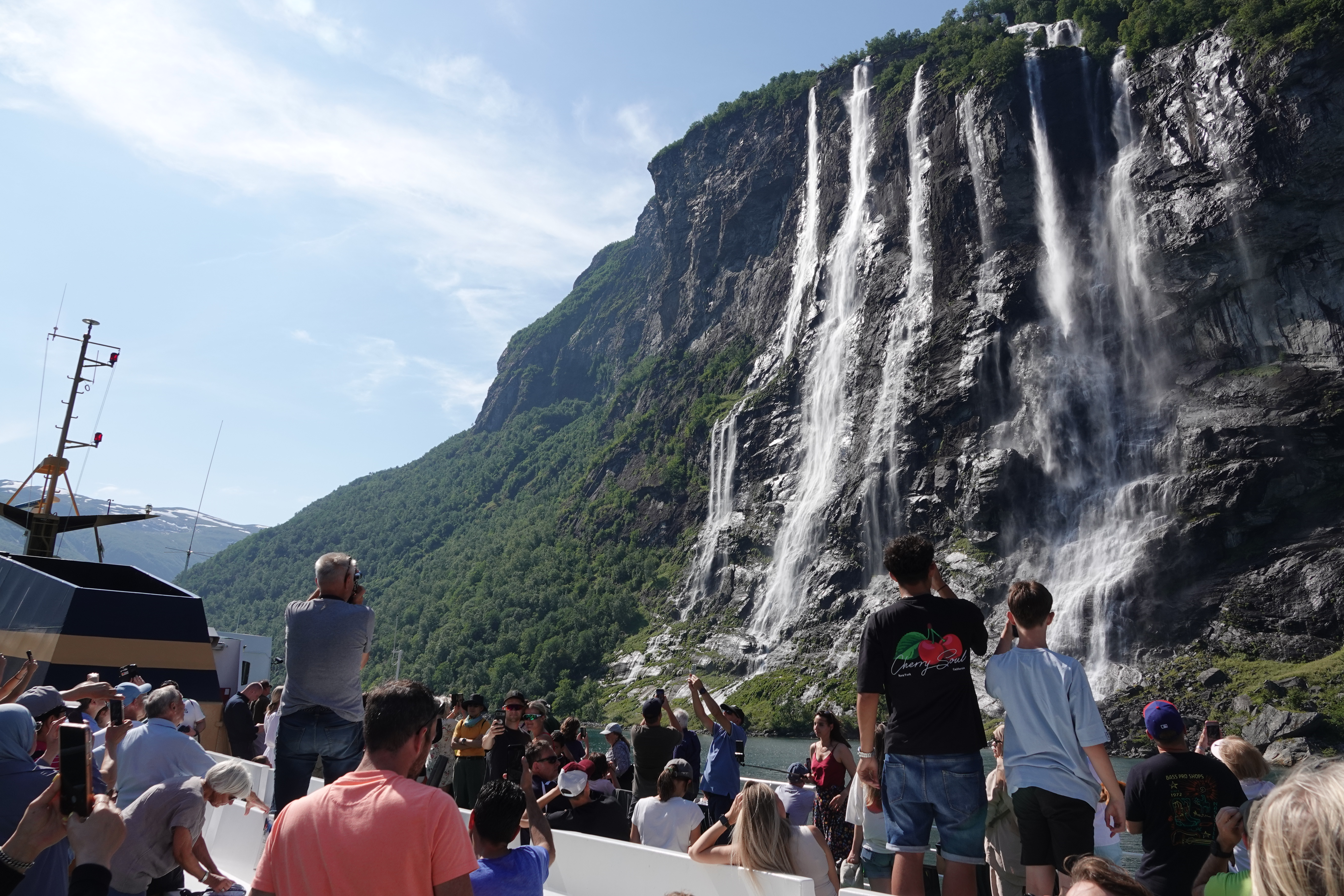 Under ferjeturen på Geirangerfjorden kjem du tett på mange fossefall. Eitt av dei mest kjende er Brudesløret. Ein annan kjend foss er Dei sju søstre, som renn grasiøst ned i fjorden.